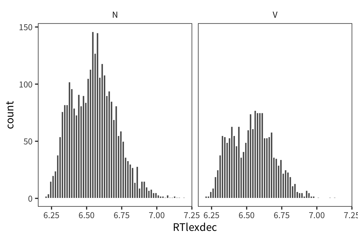 First plot the distributions of RTlexdec values, split up by whether they’re a noun or a verb…