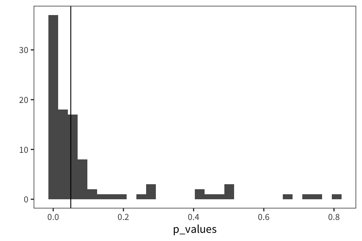 Note that some proportion of p-values, specifically 5%, is below 0.05 – these are Type I errors: cases where you are rejecting the null despite the fact that there is no effect.