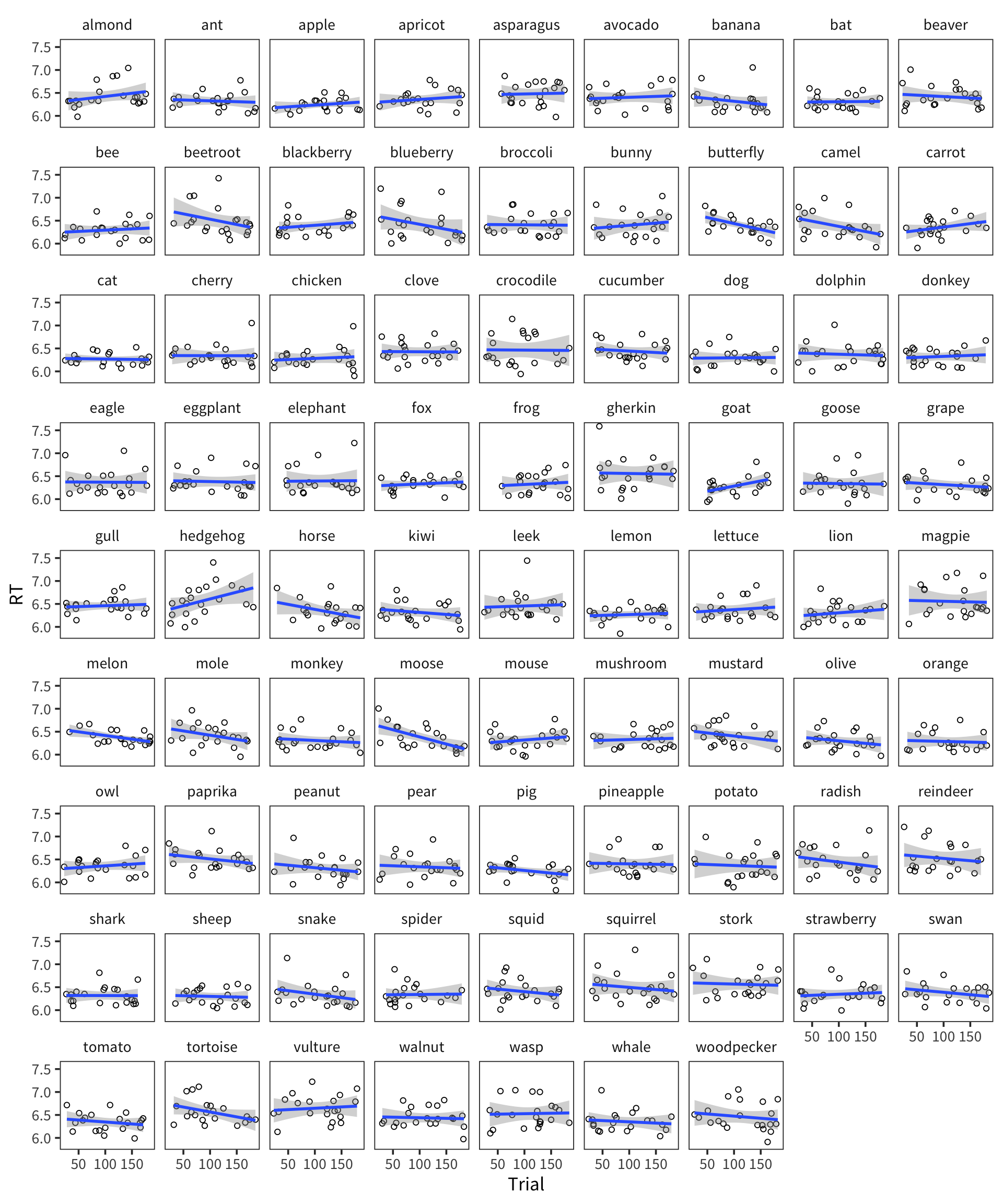 rts <- read_csv(file.path(data_source, "rts.csv"))Take a look at the lexdec dataset in the languageR package. Make a plot with RT plotted against Length, facetted by NativeLanguage What do you hypothesize about the relationships between these variables?