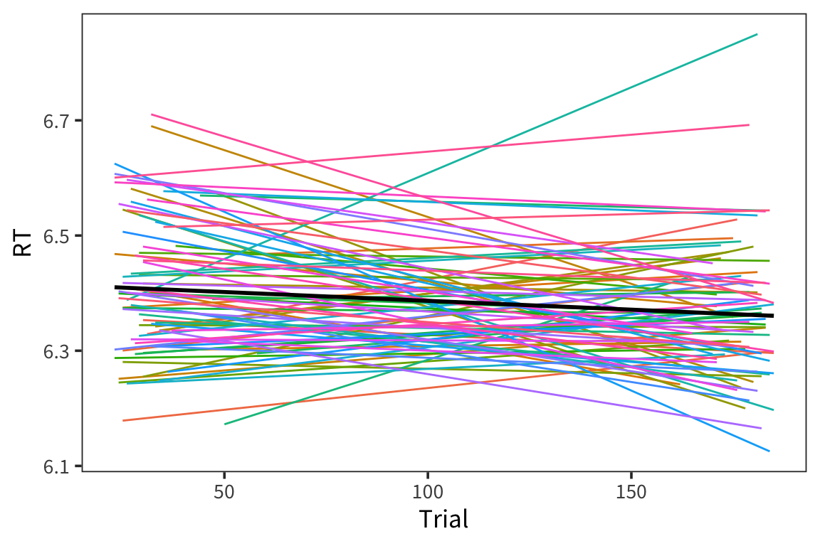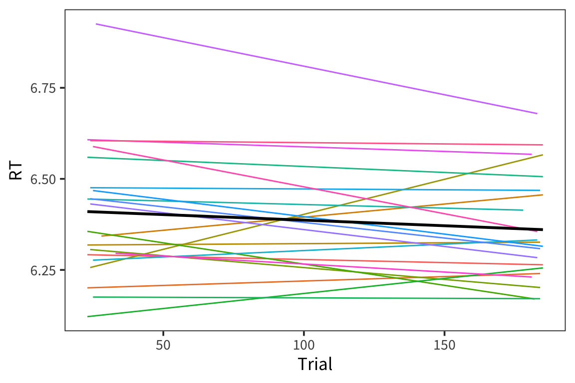 slopes_lmer <- lmer(RT ~ Trial + (Trial | Subject) + (Trial | Word),