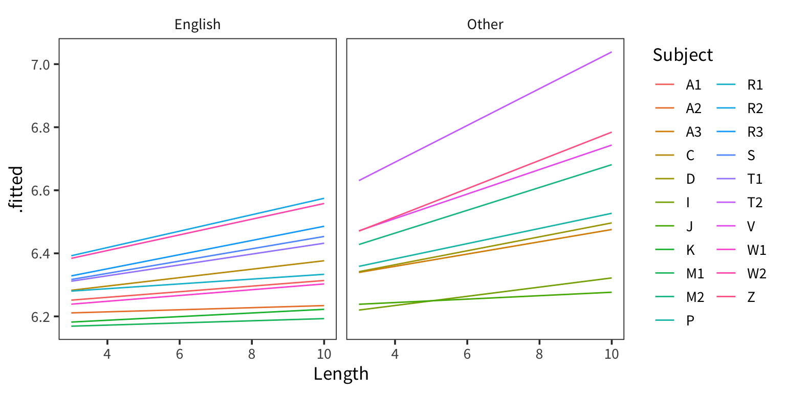 lexdec dataset from the beginning of the lab, fit the mixed effects version of the same model. Include a random intercept for Word, a random intercept for Subject, and a random slope of Length for Subject.augment().augment() with the newdata argument to generate fits for each combination of Subject, NativeLanguage, and Length. (Hint: the argument re.form let’s you specify which random effects to include. Ignore any warnings.)lexdec_mm <- lmer(RT ~ Length * NativeLanguage + (Length | Subject) + (1 | Word),