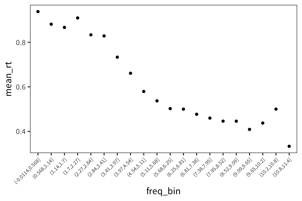 ggplot(rts_binned, aes(x = freq_bin, y = mean_rt)) +