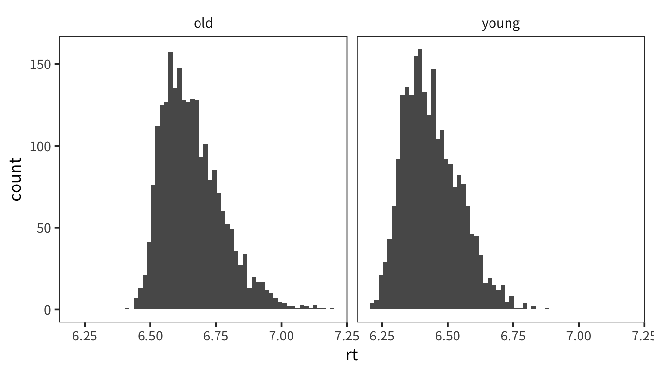 Now use facetting to make separate histograms for young and old subjects. What does this reveal about the first histogram? Do the young person data look normally distributed?