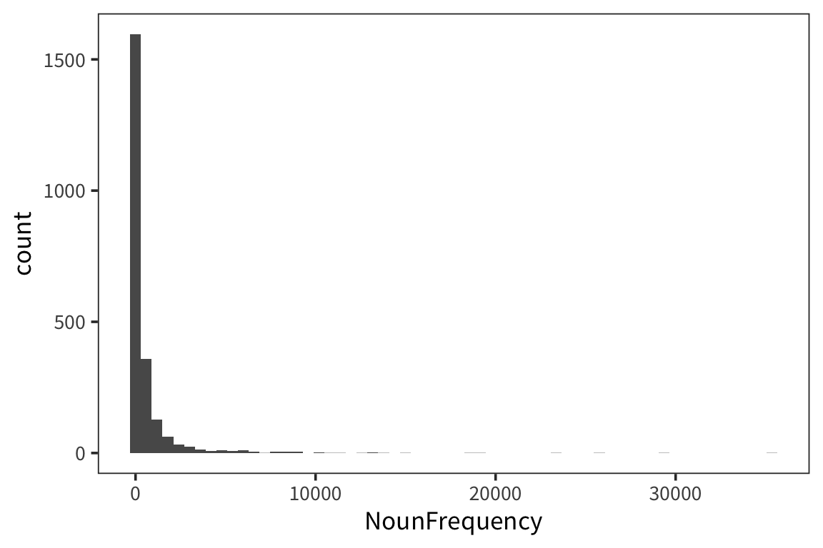 percent = 100 * count / nrow(rts_young_high))Compare the median and mean of young people RTs. How close are they? Now compare the median and mean of the column NounFrequency. What’s going on here? (i.e. why the big difference in one case?). It may be helpful to plot the distribution.
