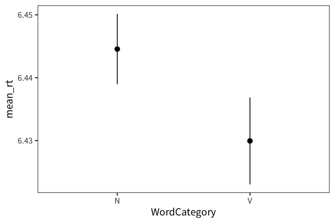 Outliers appear above, because there is no limit to how slow you can be (but there is a limit to how fast you can be).Create a plot with error bars showing 95% confidence intervals for the mean noun RT vs. the mean verb RT.