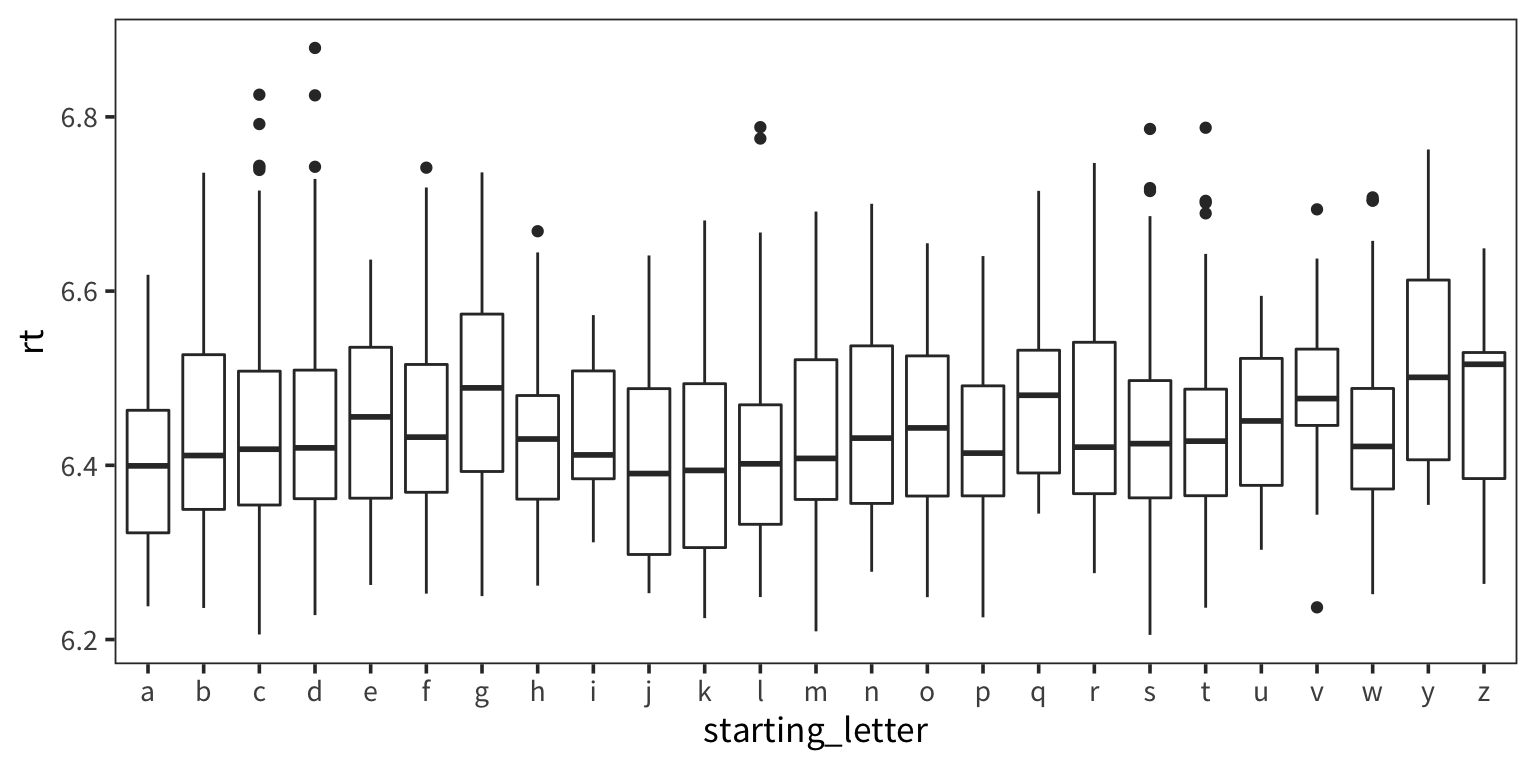 Make a boxplot (one box for each letter) showing the mean RT for each initial letter of the word, i.e. one box for ‘a’, one for ‘b’, one for ‘c’, etc.