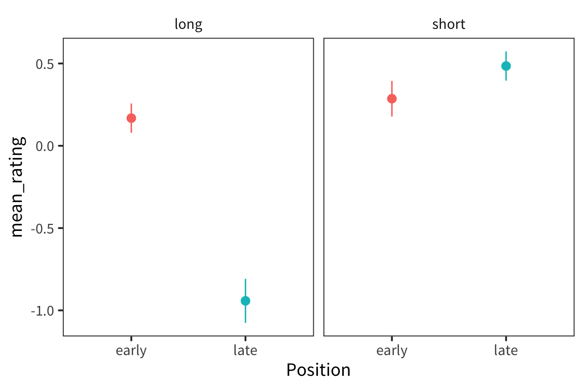 The coefficient of the intercept will fit the mean judgment for early-long items. The coefficient of Position will fit the difference between the mean judgment for late-long items and early-long items. The coefficient of Length will fit the difference between the mean judgement for early-short and early-long items. The coefficient of the interaction between Position and Length will fit the difference between the difference for late items (difference between late-short and late-long) and the difference for early items (difference between early-short and early-long).