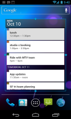 Home screens in Android 4.0 are designed to be content-rich and customizable. Users can do much more than add shortcuts — they can embed live application content directly through interactive widgets. Widgets let users check email, flip through a calendar, play music, check social streams, and more — right from the home screen, without having to launch apps. Widgets are resizable, so users can expand them to show more content or shrink them to save space.