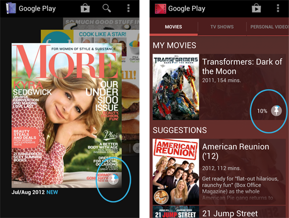 In all of the Google Play apps (Music, Books, Movies, Magazines), we wanted the current download state of each item to be visible at all times at the top-level screen. These states are: