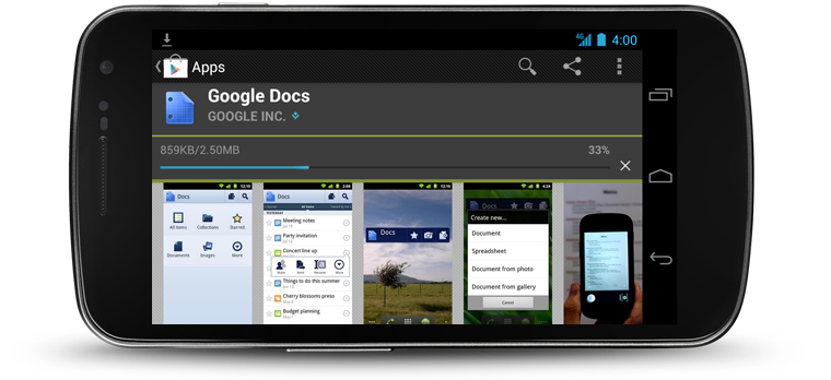 Across Google Play apps with different layouts, the same custom indicator appears with each item. It communicates download state as well as progress, in a compact package that can be incorporated into any screen design.
