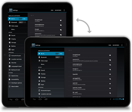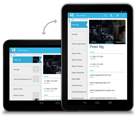 For information about how to create multi-pane layouts, read see the Building a Dynamic UI with Fragments and Designing for Multiple Screens.