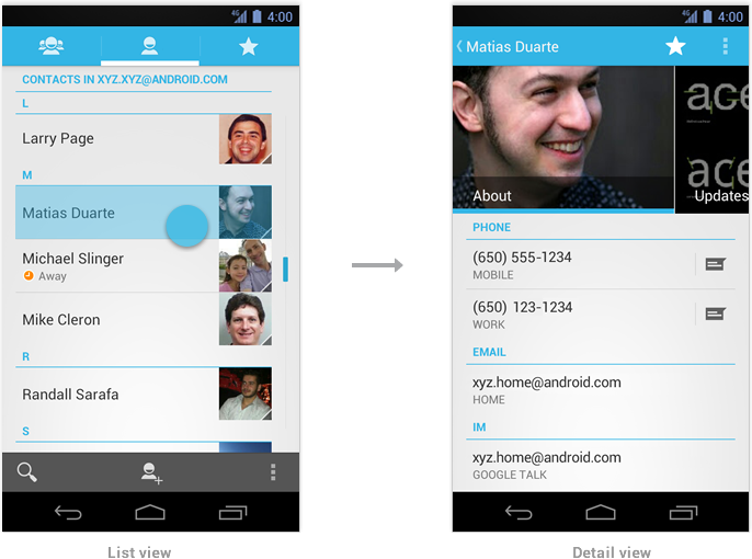 Because tablets have more screen real estate than phones, you can use panels to combine the related list and detail views into a single compound view. This uses the additional space more efficiently and makes navigating the app easier.