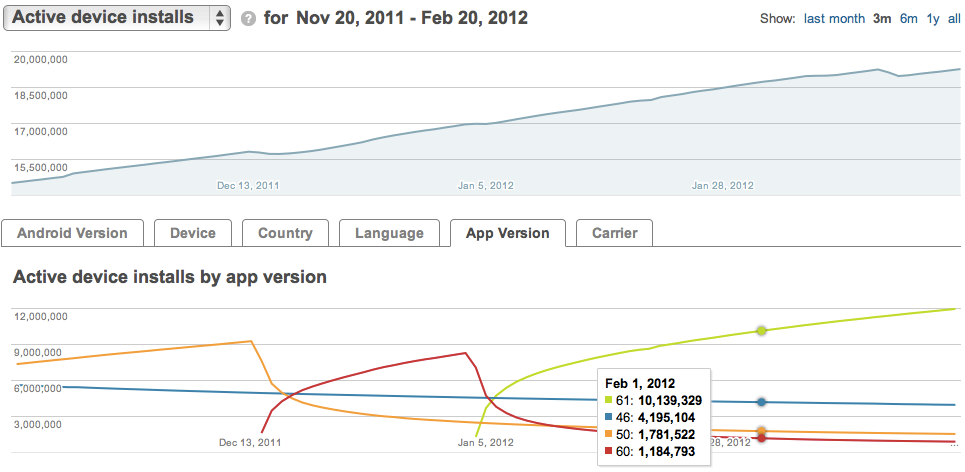 You can also view your installation data on timeline charts, for all metrics and dimensions. At a glance, these charts highlight your app’s installation peaks and longer-term trends, which you can correlate to promotions, app improvements, or other factors. You can even focus in on data inside a dimension by highlighting specific data points (such as individual platform versions or languages) on the timeline.