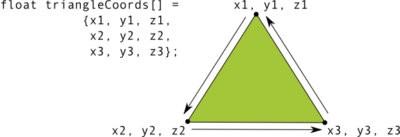 In this example, the points of the triangle are defined in an order such that they are drawn in a counterclockwise direction. The order in which these coordinates are drawn defines the winding direction for the shape. By default, in OpenGL, the face which is drawn counterclockwise is the front face. The triangle shown in Figure 1 is defined so that you are looking at the front face of the shape (as interpreted by OpenGL) and the other side is the back face.