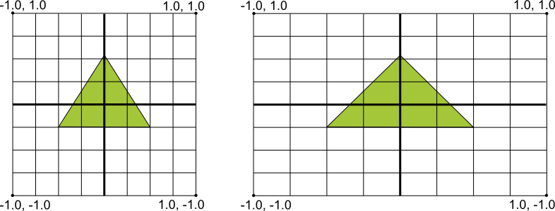 The illustration above shows the uniform coordinate system assumed for an OpenGL frame on the left, and how these coordinates actually map to a typical device screen in landscape orientation on the right. To solve this problem, you can apply OpenGL projection modes and camera views to transform coordinates so your graphic objects have the correct proportions on any display.