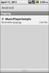 String songName; // assign the song name to songName PendingIntent pi = PendingIntent.getActivity(getApplicationContext(), 0, new Intent(getApplicationContext(), MainActivity.class), PendingIntent.FLAG_UPDATE_CURRENT); Notification notification = new Notification(); notification.tickerText = text; notification.icon = R.drawable.play0; notification.flags |= Notification.FLAG_ONGOING_EVENT; notification.setLatestEventInfo(getApplicationContext(), "MusicPlayerSample", "Playing: " + songName, pi); startForeground(NOTIFICATION_ID, notification);