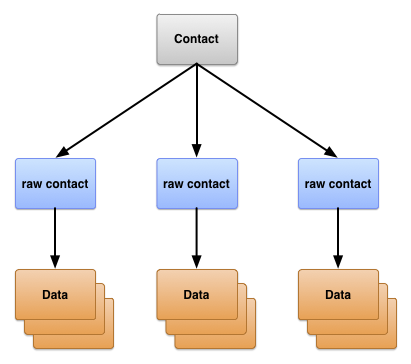 As noted previously, the data for a raw contact is stored in a ContactsContract.Data row that is linked to the raw contact's _ID value. This allows a single raw contact to have multiple instances of the same type of data such as email addresses or phone numbers. For example, if "Thomas Higginson" for emilyd@gmail.com (the raw contact row for Thomas Higginson associated with the Google account emilyd@gmail.com) has a home email address of thigg@gmail.com and a work email address of thomas.higginson@gmail.com, the Contacts Provider stores the two email address rows and links them both to the raw contact.