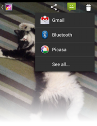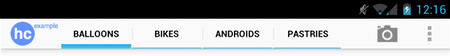 Figure 1. Action bar from the Honeycomb Gallery app (on a landscape handset), showing the logo on the left, navigation tabs, and an action item on the right (plus the overflow menu button).