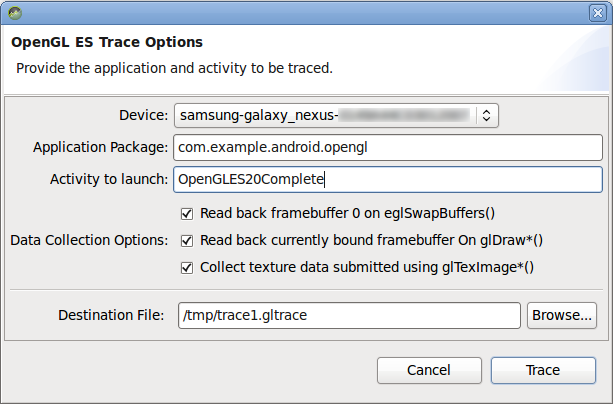 - In Eclipse or Device Monitor, activate the Tracer for OpenGL ES perspective.
