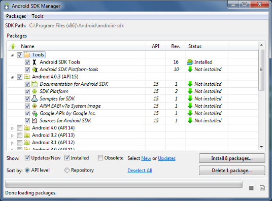 Figure 1. The Android SDK Manager shows the SDK packages that are available, already installed, or for which an update is available.
