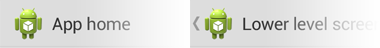 The app icon establishes your app's identity. It can be replaced with a different logo or branding if you wish. Important: If the app is currently not displaying the top-level screen, be sure to display the Up caret to the left of the app icon, so the user can navigate up the hierarchy. For more discussion of Up navigation, see the Navigation pattern.