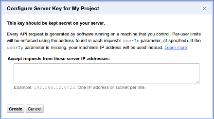 2. Click Create new Server key. Either a server key or a browser key should work. The advantage to using a server key is that it allows you to whitelist IP addresses. The following screen appears: