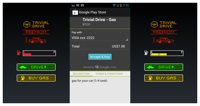 - This sample shows how to use the In-app Billing Version 3 API to implement in-app product purchases for a driving game. The application demonstrates how to send In-app Billing requests, and handle synchronous responses from Google Play. The application also shows how to record item consumption with the API. The Version 3 sample includes convenience classes for processing In-app Billing operations as well as perform automatic signature verification.