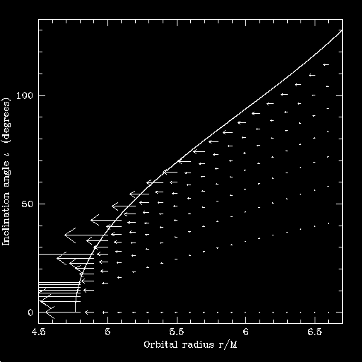 The line in this plot gives the angle at each radius of the least-bound stable orbit; orbits at higher inclination angle are unstable, and so are astrophysically irrelevant. The tail of each arrow gives the (r, iota) coordinates of a particular orbit. The arrow points in the direction to which radiation reaction pushes the arrow, and the length is proportional to the rate at which the evolution occurs.