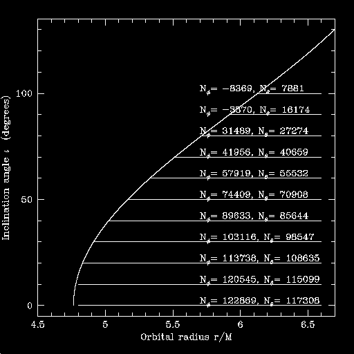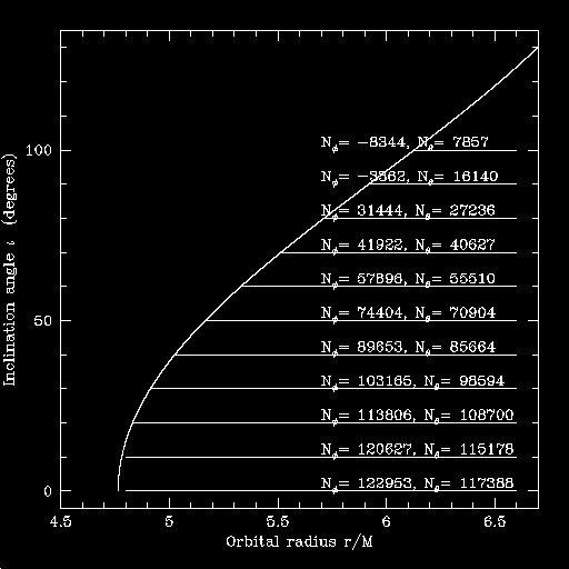 Using this field of data points, I evolve a set of orbits. The orbits start at r/M = 4 and various values of iota. I use cubic spline interpolations to find the values of dr/dt and d(iota)/dt at arbitrary coordinate points, given the field of data shown above.