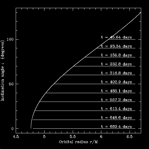 The time given at each trajectory is the number of days it takes to spiral in.