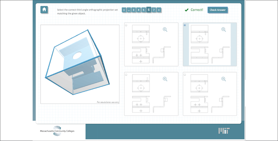 - Ortho-to-3D Online Learning Module: Assessments in which students are tested on whether they can find the correct 2D projection based on analyzing an interactive 3D rendering of an object (or physical object), or vice versa. Lead participant: Quinsigamond Community College