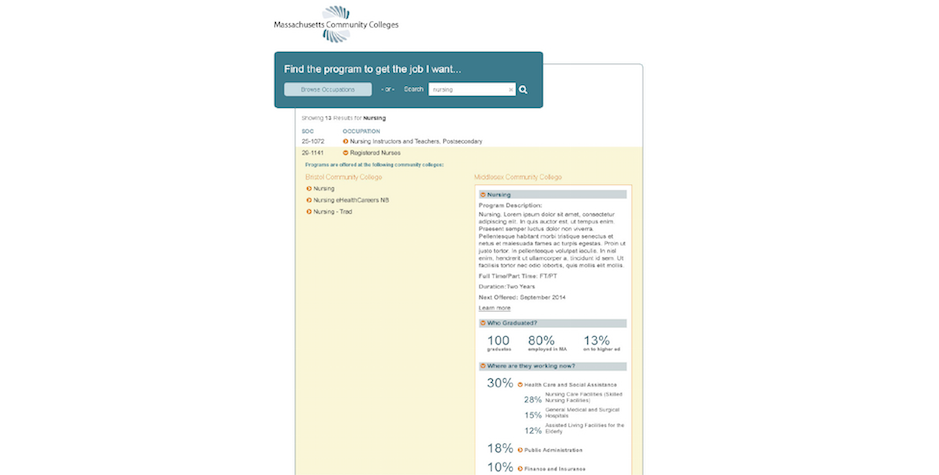 In addition, MIT collaborated with MCCWDTA and Bristol and Middlesex Community Colleges to develop a proof of concept “data bus” to enable current investments by the community colleges and career centers in their systems to support broader functionality and allow them to be methodically improved and integrated over time. MIT conducted a needs analysis and identified an opportunity for integration that enables “job seekers to make informed and time sensitive decisions based on actual educational offerings that will help them secure a job or improve their job skills”. Working closely with partner colleges, the proof of concept integrates occupations from career centers with programs offered by the colleges and employment data from Massachusetts’ Higher Education Information Resource System (HEIRS).