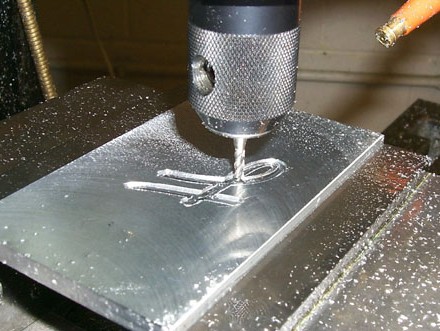 run g-code Using the facing tool for the mill, face the aluminum inserts to give a flat, smooth, surface finish. Cut pieces to 5" x 3", then run your g-code to make a negative of the piece to be molded. Here, the molded piece is being cut with a 3/8" flat bit. |