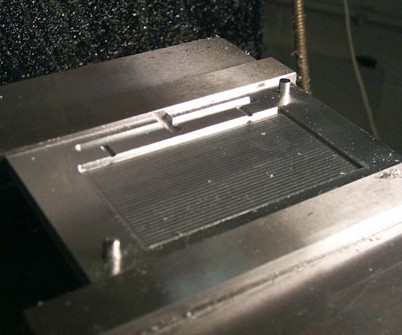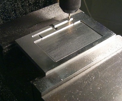 flow channels It is now time to mill your flow channels. Note that there is an over-run at the end of each line to accept the cold 'nose' of incoming polymer. This ensures that hot flowing polymer enters your mold. At left is the milling recess at the opposite end of the mold. |