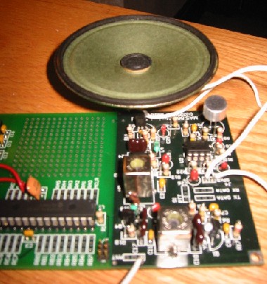 radio assembly The radio side of the project board begun last week was built using the assembly instructions by Matt Reynolds. Testing revealed a number of points that had not been properly soldered and eventually demonstrated that the speaker could scratch, static, and hum quite well. After adjustments were made to the tuning slugs with the aid of an oscilloscope and a signal generator, the board could be used to transmit/receive the signal generator tone or a voice. |