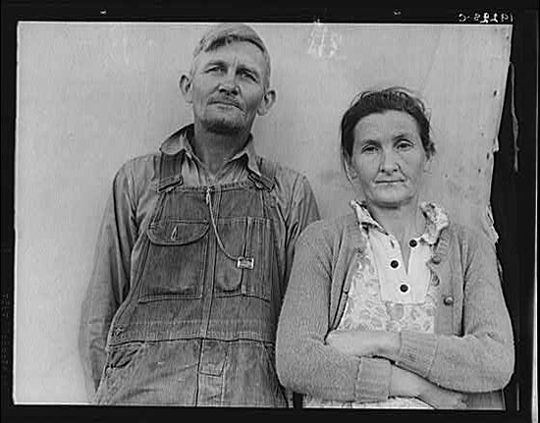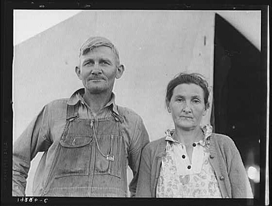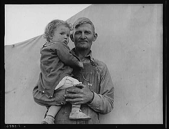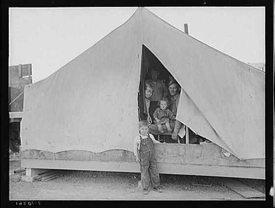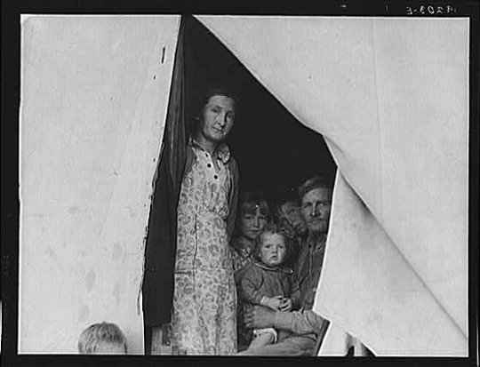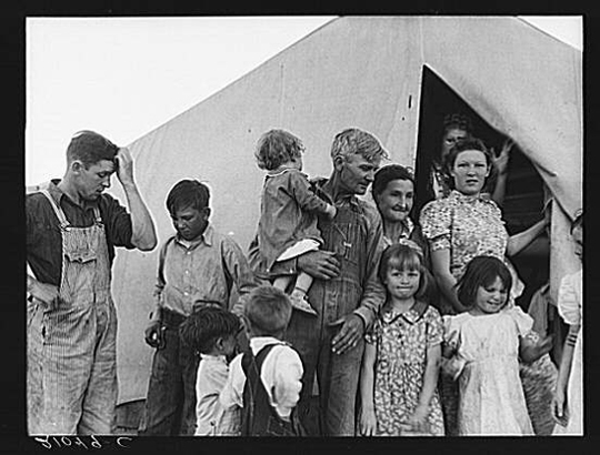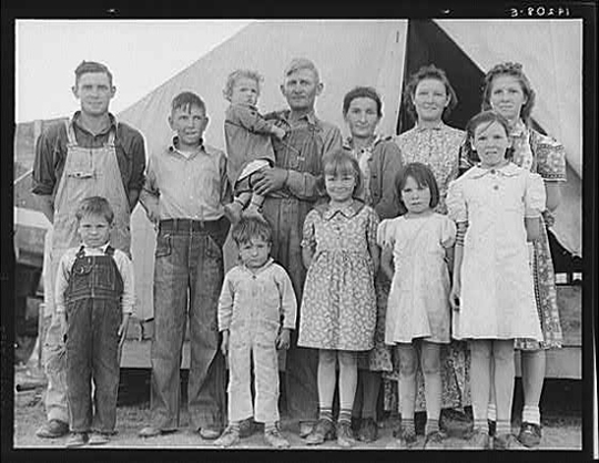 Brawley, Imperial Valley, Feb. 23, 1939. In FSA migratory labor camp. Family, mother, father, and 11 children, originally from near Mangrum Oklahoma, where he had been a tenant farmer. Came to California in 1936 after drought. Since then have been travelling from crop to crop in California following the harvest. Six of the 5 children attend school wherever the family stops long enough. Five older children work along with mother and father. Feb. 23rd, two of the family had been lucky and “got a place” (a day’s work) in the peas on the Sinclair ranch. Father had earned $1.73 for ten-hour day. Oldest daughter had earned $1.25. From these earnings had to provide their transportation to the fields, 20 miles each way. Mother wants to return to Oklahoma, father unwilling. She says, “I want to go back where we can live happy, live decent, and grow what we eat.” He says, “We can’t go fixed the way I am now. We’ve got nothing in the world to farm with. I made my mistake when I came out here.”