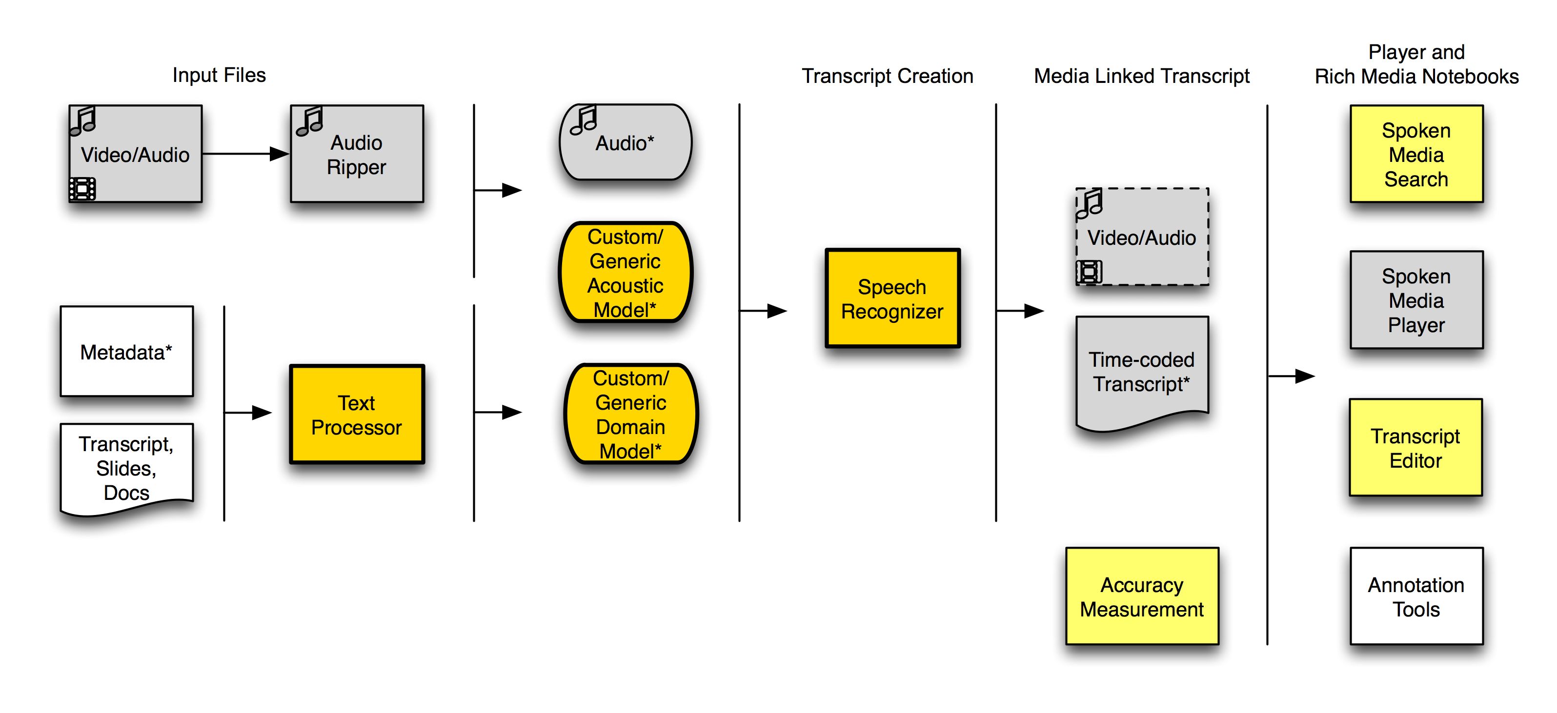 Here’s a workflow diagram I put together to demonstrate how we’re approaching the problem of searching over the transcripts of multiple videos and ultimately returning search results that maintain time-alignment for playback.