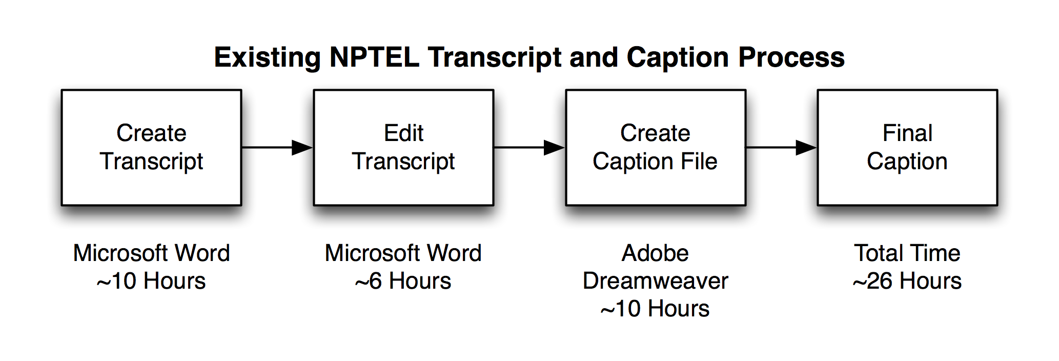 The current NPTEL transcription and captioning process is labor and time intensive. During our discussions, we learned that it takes approximately 26 hours on aveage to transcribe and caption a single hour of video. Even with the initial hand transcription, they are averaging 50% accuracy.