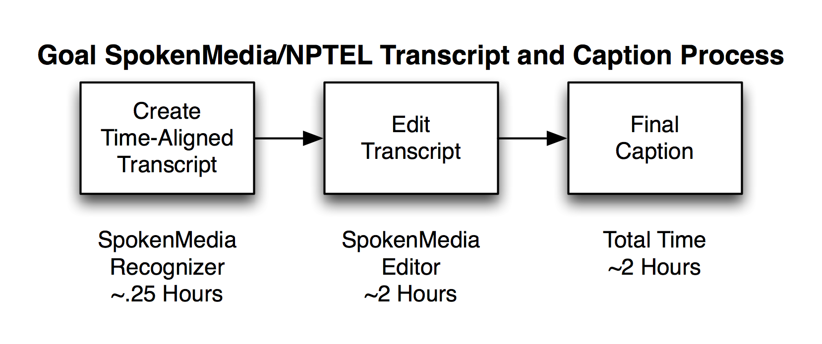We discussed using the untrained SpokenMedia software to improve the efficiency of this initial process. Our initial experiments suggest that the untrained recognizer can achieve 40-60% accuracy, which is in the same range as the current NPTEL hand process. Thus we propose replacing the hand transcription and captioning steps with a two step recognition and editing process. Using a single processor, the recognition step takes on the order of 1.5 hours per 1 hour of video. Using this estimate coupled with the existing editing time in use at NPTEL, the overall process might be reduced from 26 hours to approximately 10 hours.