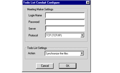 The Meeting Maker ToDo Conduit synchronizes your Meeting Maker Todo List with the Palm Todo list.