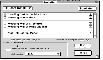 to restart your Macintosh. Meeting Maker installation:To use Custom Install: