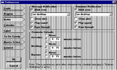 Note: Message notifications alert you that you have received a new invitation or changes about a meeting. Reminder notifications can alert you that it is almost time for an activity or meeting. You may want to set different preferences for messages and reminders. For example, you may want the "burn-through" window to pop up when it is time for a meeting but not have "burn-through" pop up for an incoming meeting invitation.