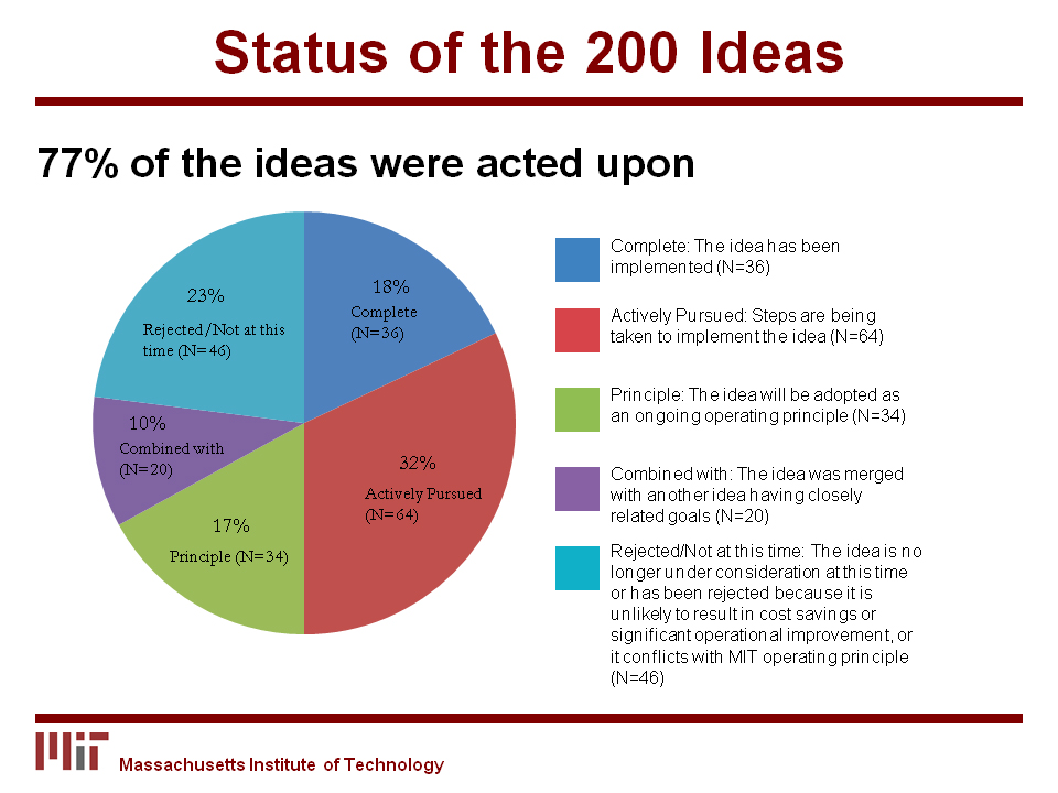 These kinds of questions led to the over 200 total ideas generated by the Task Force's working groups. We have compiled a spreadsheet that details what the ideas were and whether or not they were acted upon. Each idea was assessed by a relevant operating unit, given a specific response, and assigned a status In all, 77% of the ideas were acted on, and many of these already have been implemented. Accompanying the spreadsheet is a pie chart (also shown below) illustrating the distribution of ideas according to their status.