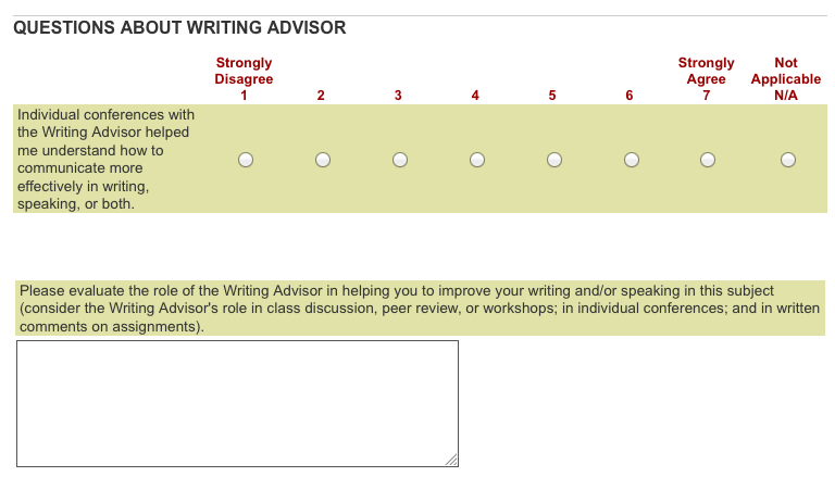 You may choose the number of scale items (up to 10) and the label of each. The Institute questions use a 7-point scale. The most positive response may be the highest number (e.g. 1=Strongly Disagree and 7=Strongly Agree) or the middle number (e.g. 1=Too slow, 4=Just right, 7=Too fast). You may choose whether or not to include a “Not Applicable” option for students.