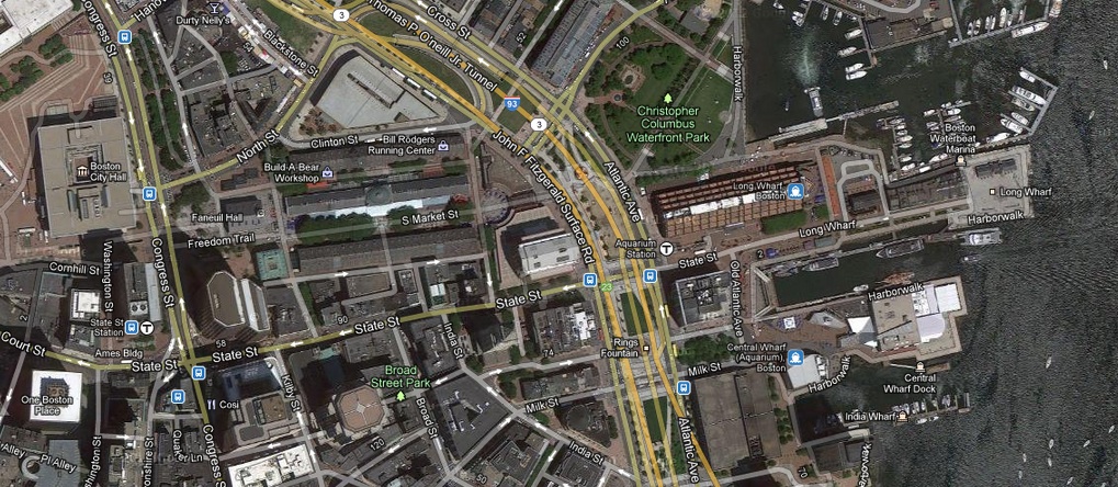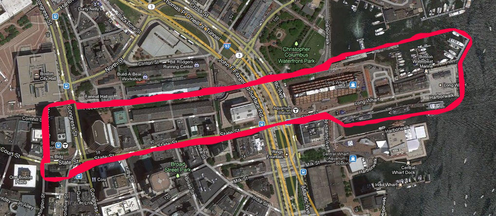 For my site I have chosen to do the area that stretches from the Long Wharf through Faneuil Hall to the Old State House. The boundary of this site extends from the waterfront west along State St. The border loop around the Old State House and then proceed north behind the Citizens Bank building and around it heading east again, cutting right through the Faneuil Hall Marketplace and the Greenway until the border hits the waterfront again. The site is made up of a long thin strip from the heart of Boston to the harbor.