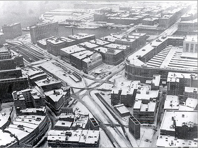 The shift to automobile transportation lead to three major changes for Dewey Square. First of all, there is the presence of the expressway itself. Its noise and pollutants must have inevitably changed the way people behaved in the area. Second, the accessibility the expressway provided was desirable for businesses. This made Dewey Square an attractive location for developing skyscrapers, causing the site to become part of Boston's vibrant financial district of the course of the following three decades after the introduction of the Expressway in the 1950's. By 1974 we can see the Stone and Webster office Building between Summer and Congress Street, the older buildings around the expressway are demolished. A third and equally important development is the shift away from rail transport. The streetcars are gone, the Atlantic Avenue Elevated is gone, and the South Station railway terminal largely demolished and repurposed after the two railroad companies serving it went bankrupt because their passengers disappeared. South Station wouldn't regain its functionality as a railway terminal until its renovation in 1989.