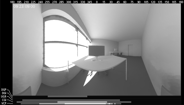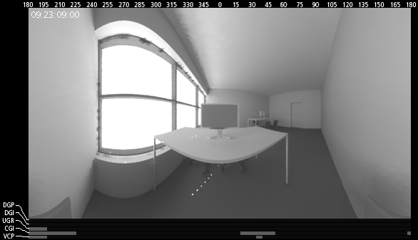 The animated image shows a cylindrical 360o view of a work space in a studio sapce. The color coded lines at the bottom show the predictions of different glare indices (DGP, DGI, UGI, CGI and VCP) whether discomfort glare will be experienced in a particular direction at at different times of the day (Green=Imperceptible Glare; Yellow=Perceptible Glare; Orange=Disturbing Glare; Red=Intolerable Glare). |