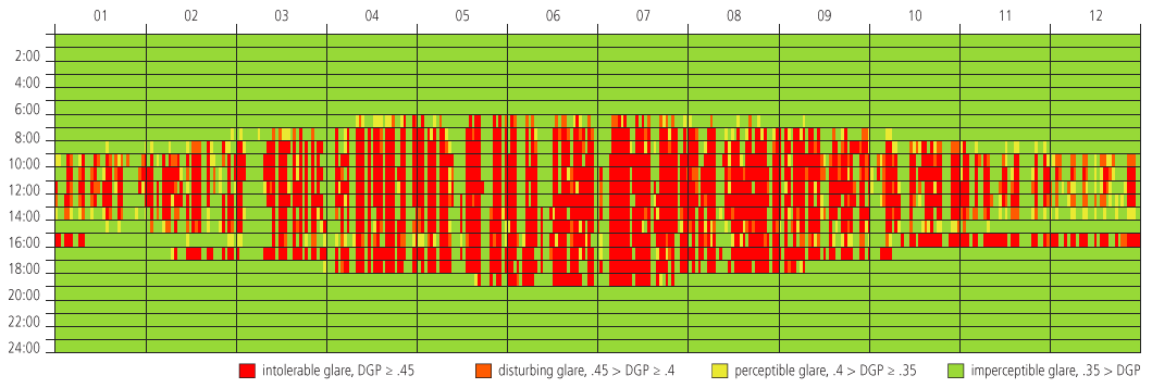 Fig 3: Annual Daylight Glare Probability simulation; the x-axis corresponds to different days of the year, the y-axis corresponds to time of day. Red and orange fields correspond to hours with intolerable or disturbing glare, respectively more>>.