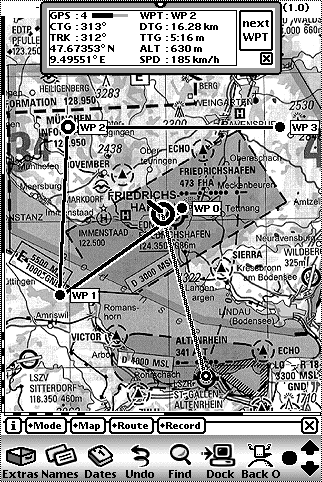 Das Bildschirmfoto vom MessagePad 2000 zeigt die neue Graustufenversion der ICAO-Fliegerkarte für Deutschland im Bereich Friedrichshafen (Bodensee). Das Bild enthält zudem eine Route mit 4 Wegpunkten, sowie eine Standlinie zum Flugplatz Altenrhein in der Schweiz.
