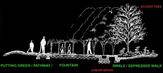 This section originally drafted to a 1"=2'-0" scale, shows the fountain and it's accesibility to participation. The water from the fountain is collected in a linear drain and poured into a depressed walkway or seasonal swale. This swale responds to the built edge on one side and the unbuilt on the other. Granite stones with a granite coping line the built edge, while wetland planting including sedges etc., line the unbuilt edge. |
